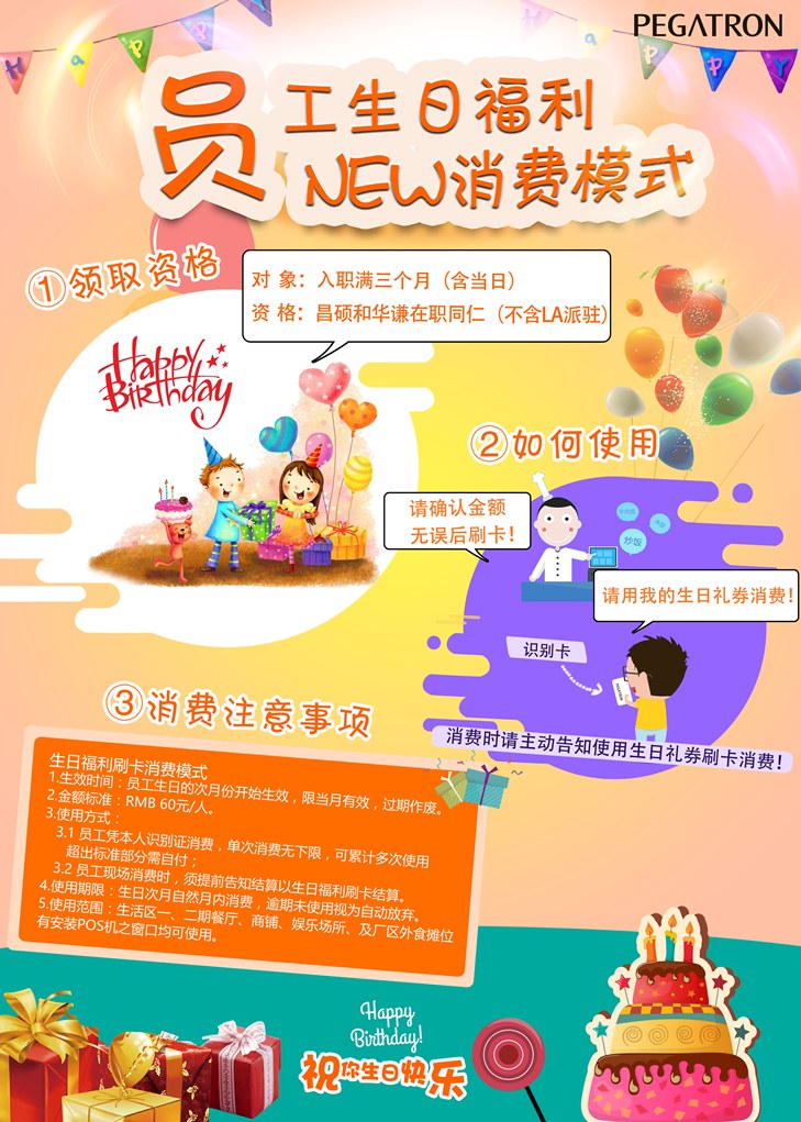 - 使用方式:a.員工憑本人識別卡消費,單次消費無下限,可累計多次使用,超出標準部分需自付;b.員工現場消費時,需提前告知以生日福利刷卡消費結算。