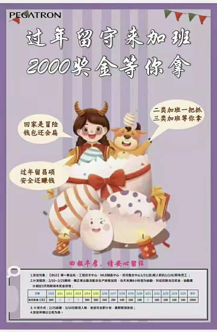 2.計發規則: 2/10-2/25期間。需正常出勤及配合生產排程加班.當天未滿8小時視為缺勒.對應扣除當日獎金.缺勤累